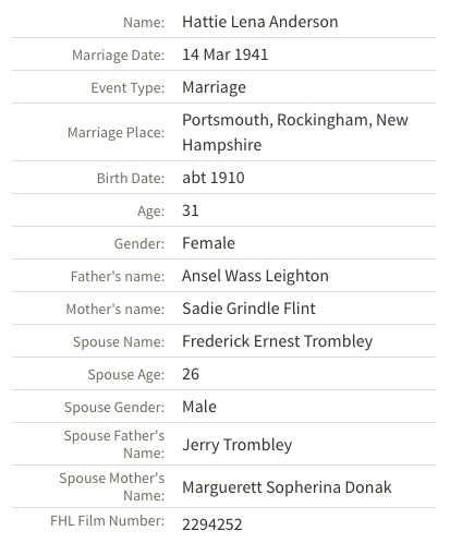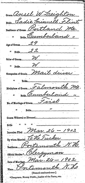 Ansel W. Leighton and Sadie Grinnell FlintMarch 26, 1902Portsmouth, NH