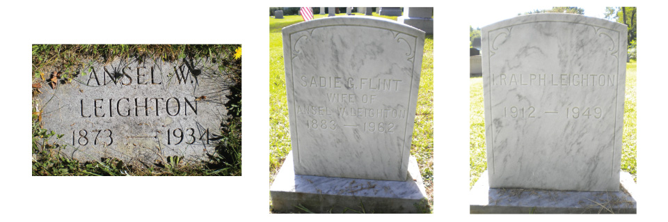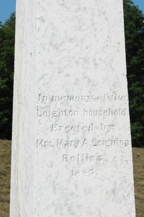 Close up of the inscription on the Leighton monument. It is my understanding that the monument was erected by the children of Mary Leighton Rollins as requested in her will. Also on the site is the gravestone of John Leighton who is believed to be a brother of Mary Leighton Rollins. It is not known if there are other graves at the site.