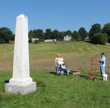 Monument erected in honor of the original Leighton household [a 10-acre upland known as Leighton's Hill] which is currently on private land owned by Robert Simpson near Back River Road. The Simpson's house, in the background, is probably built on what was once known as Leighton's Hill.